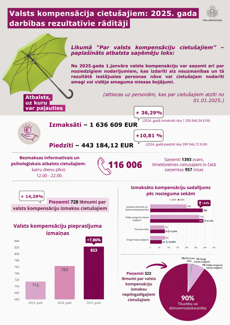 Tiesu administrācija ir apkopojusi 2025. gada darbības rezultātus, kas apliecina stabilu progresu valsts kompensāciju izmaksu efektivitātē un līdzekļu atgūšanā noziedzīgos nodarījumos cietušajām personām. Pārskata periodā, īstenojot Eiropas Sociālā fonda Plus (ESF+) projekta “Pieeja tiesiskumam” kampaņu “Atbalsts, uz kuru var paļauties”, īpaša uzmanība tika veltīta starpinstitucionālās sadarbības veicināšanai. Gada laikā organizēti trīs vērienīgi izglītojoši semināri, kuros kopumā piedalījās 169 nozares speciālisti – policijas darbinieki, bāriņtiesu pārstāvji un sociālie darbinieki – no visas Latvijas, tādējādi stiprinot vienotu izpratni par cietušo personu tiesībām un atbalsta mehānismiem.