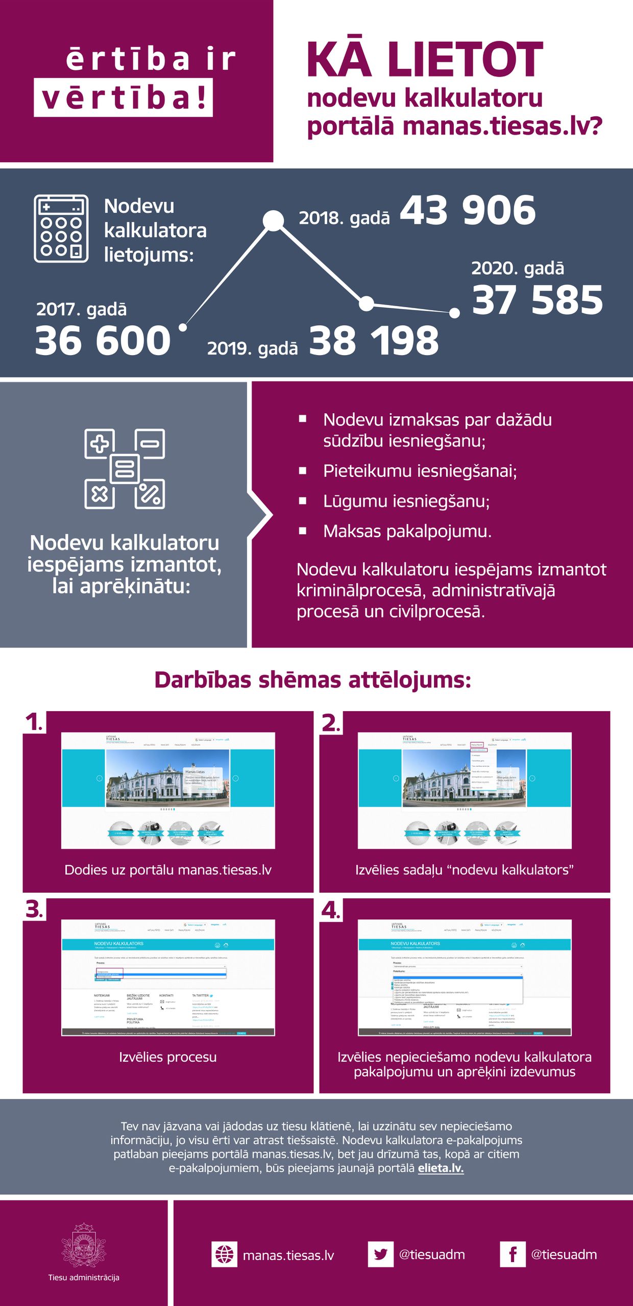 Jau 2017.gadā iedzīvotāji vairāk nekā 36,6 tūkstošus reižu izmantoja nodevu kalkulatoru tiešsaistē, kas pērn, kad valstī bija izsludināta ārkārtējā situācija pieauga līdz 37,6 tūkstošiem reižu. Šo e-pakalpojumu var izmantot dažādās tiesvedībās, tostarp, lai veiktu aprēķinus kriminālprocesā, administratīvajā procesā, kā arī civilprocesā. Šis ir ērts veids kā taupīt laiku pirms dokumentu iesniegšanas tiesā, jo ieskatoties nodevu kalkulatorā var pārliecināties par visiem ar tiesvedību saistītiem izdevumiem.