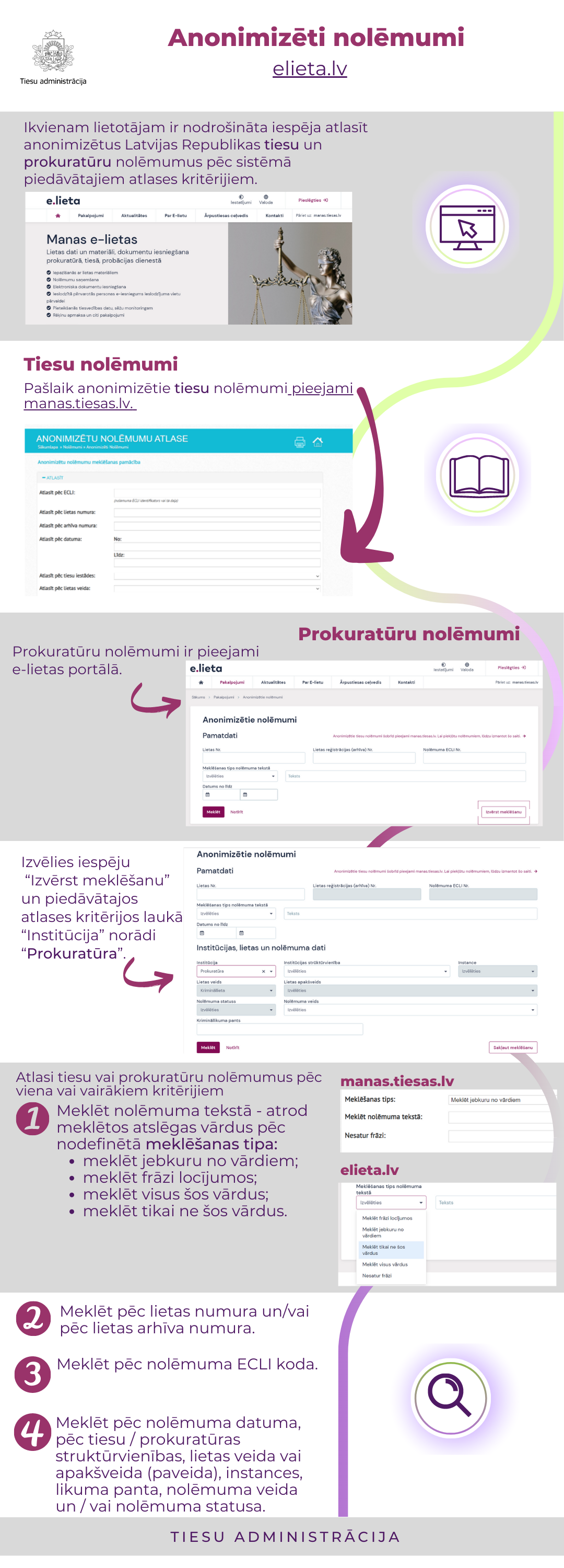 E-lietas portālā www.elieta.lv ikvienam lietotājam ir nodrošināta iespēja atlasīt anonimizētus Latvijas tiesu un prokuratūru nolēmumus pēc sistēmā piedāvātajiem atlases kritērijiem. Portāla sadaļā Anonimizētie nolēmumi ir publicēti anonimizēti, spēkā stājušies Latvijas tiesu spriedumi, kas pieņemti pēc 2013. gada 1. septembra un anonimizēti prokuroru gala nolēmumi kriminālprocesos, kas pieņemti, sākot ar 2023. gada 1. janvāri.