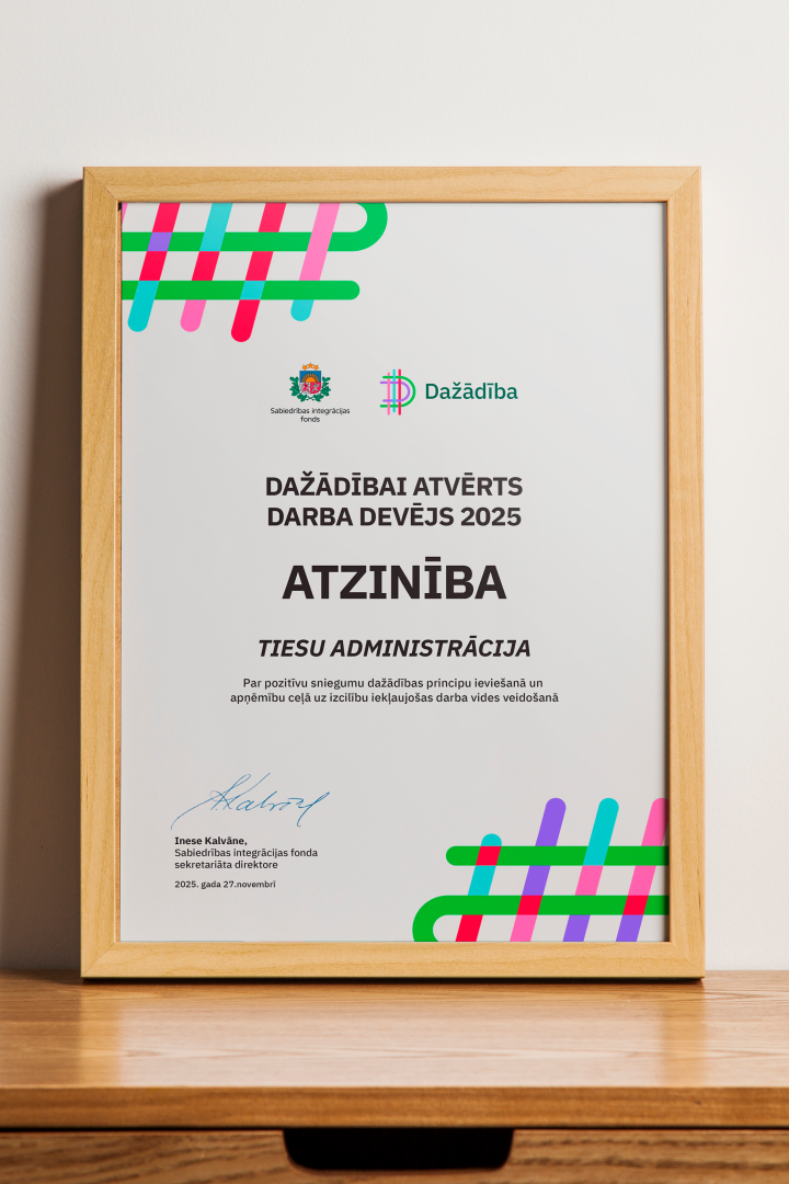 Atzinību par pozitīvu sniegumu dažādības principu ieviešanā un apņēmību ceļā uz izcilību iekļaujošas darba vides veidošanā saņēma arī Tiesu administrācija.