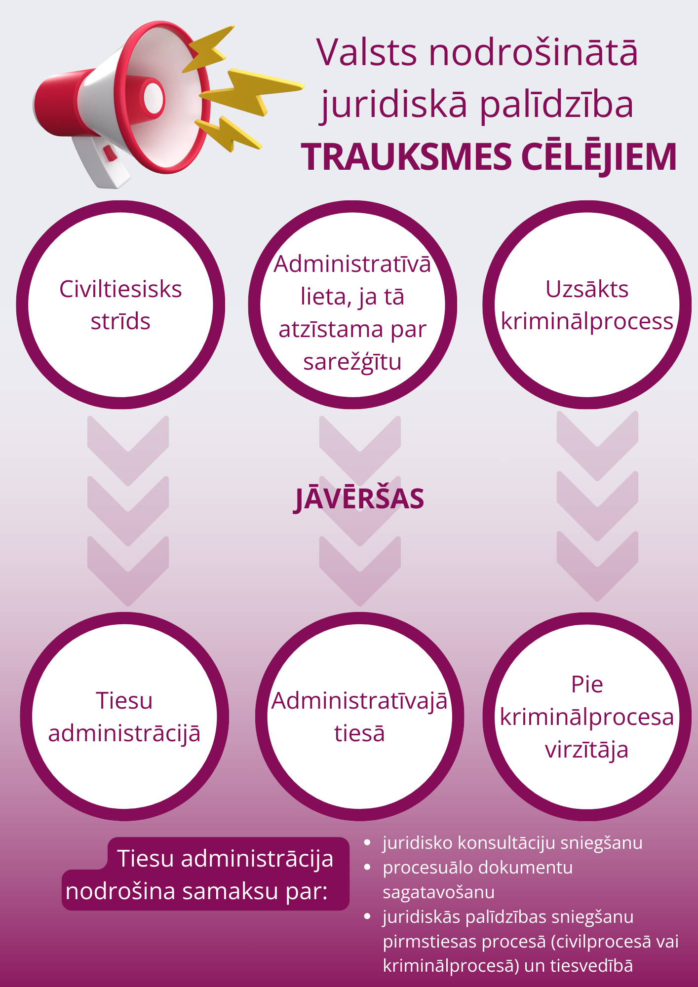 Juridisko palīdzību var saņemt, ja trauksmes cēlējam trauksmes celšanas rezultātā ir radušās nelabvēlīgas sekas, kuru risināšanai nepieciešama juridiskā palīdzība. Juridisko palīdzību piešķir, lai trauksmes cēlēju aizsargātu no nelabvēlīgām sekām, kuras ir radušās tāpēc, ka trauksmes cēlējs ir sniedzis trauksmes cēlēja ziņojumu.